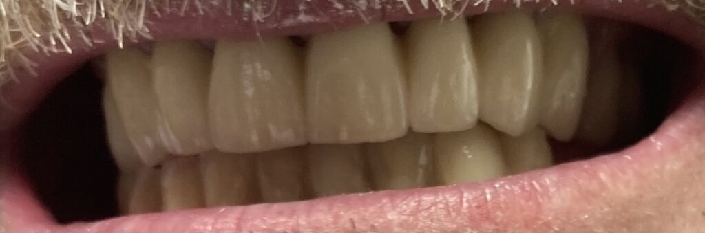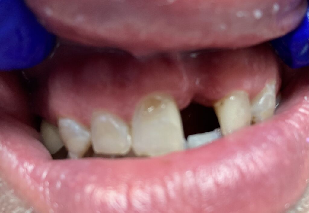Pacjent zgłosił się w celu uzupełnienia braku lewej górnej jedynki oraz poprawy estetyki pozostałych zębów. Pacjent nie zdecydował się na leczenie implantoprotetyczne. Wykonano most i korony porcelanowe.