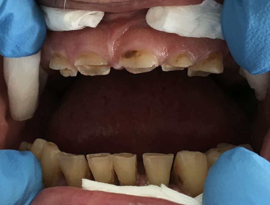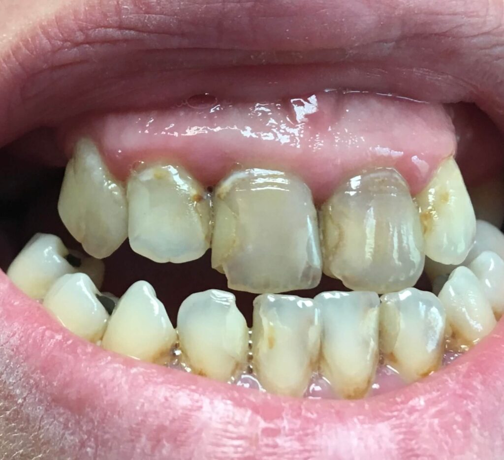 Pacjent ze starciem zębów zgłosił się w celu poprawy ich estetyki. Wykonano odbudowę metodą flow injection (bonding) oraz odtworzono prawidłową wysokość zwarcia.