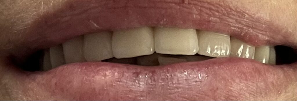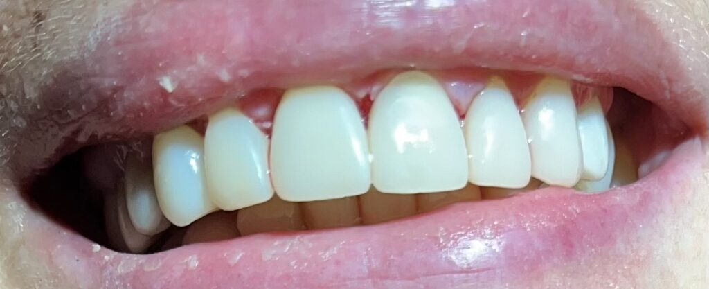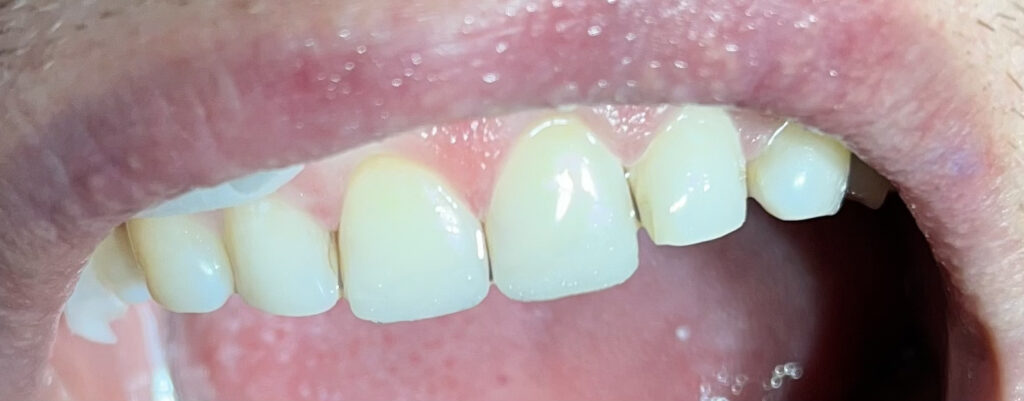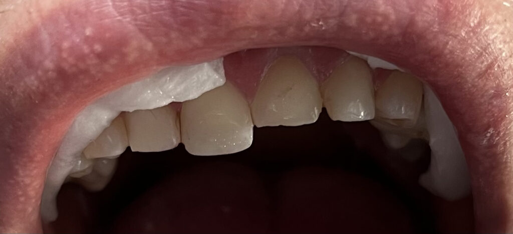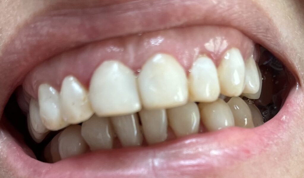 Pacjentka z nadbudową kompozytową zębów przednich. Zaproponowano wymianę nadbudowy celem poprawy estetyki i funkcjonalności. Odpowiedni kształt odbudowy jest niezbędny do zachowania w zdrowiu tkanek przyzębia. Wykonano nadbudowę metodą flow injection (bonding).